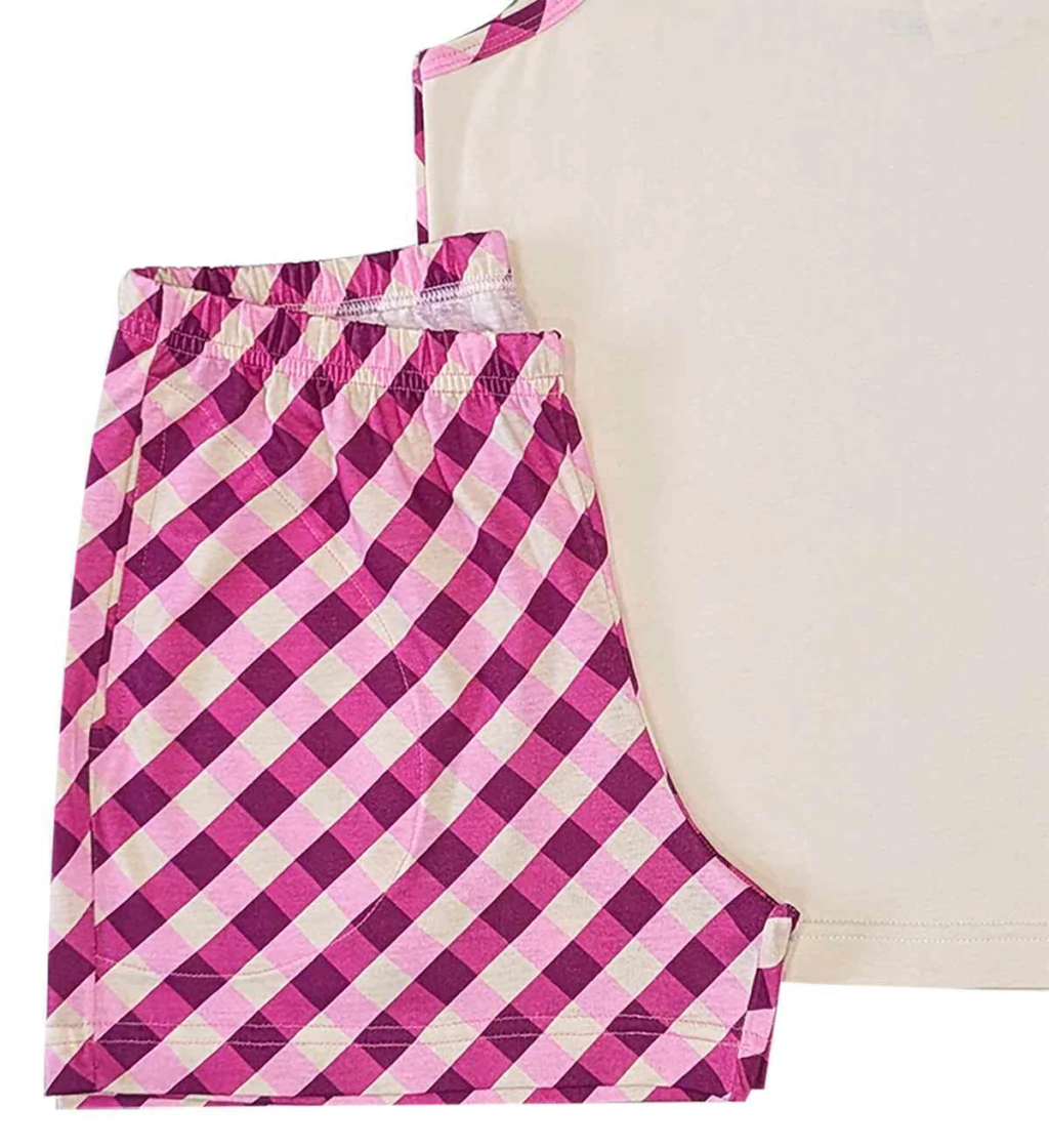 O shorts estampado em padronagem xadrez conta com cós elástico macio e bolsos funcionais, unindo praticidade e estilo para quem valoriza conforto com detalhes.