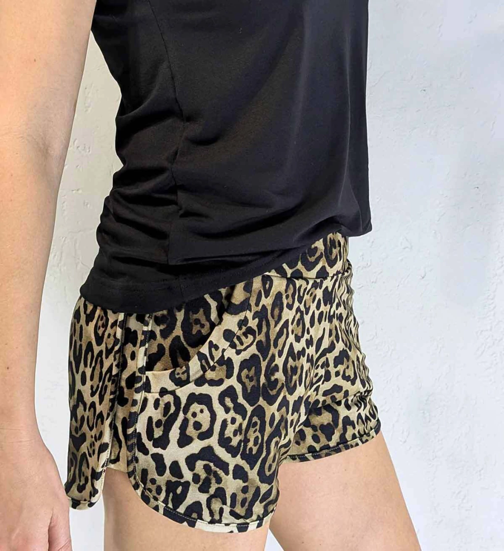 A blusa preta possui decote em V com detalhe de renda e alças finas de viés estampado. O short, com estampa animal print moderna, traz cós largo com elástico embutido, garantindo mais conforto na cintura, modelagem levemente mais comprida na parte de trás, além de bolsos funcionais e acabamento arredondado na barra, que deixa o visual mais delicado e feminino.